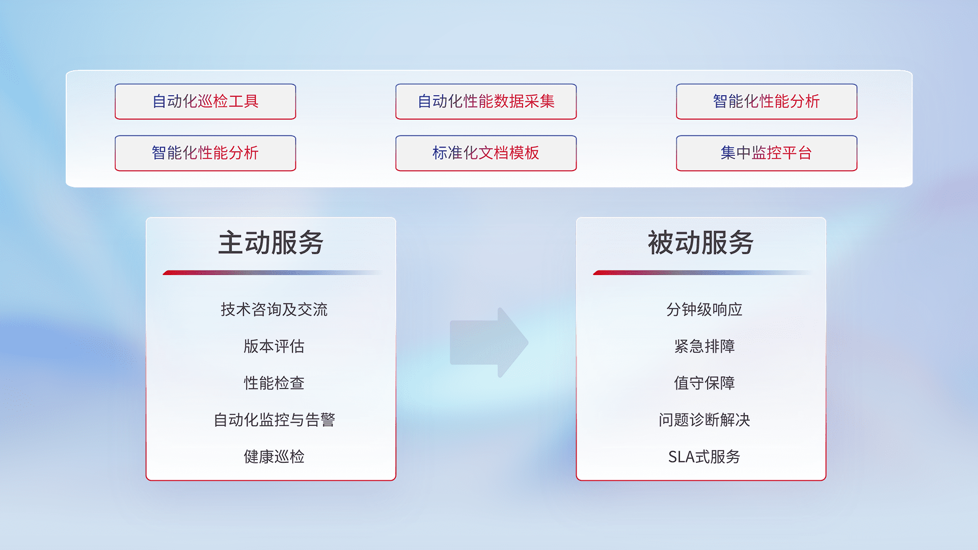 智能化工具和标准化文档,,保障服务质量,,,提供主动服务(包含技术咨询、、、、版本评估、、性能检查、、、自动化监控与告警、、健康巡检)和被动服务包含(分钟级响应、、、、紧急排障、、、、值守保障、、问题诊断解决、、SLA服务)。。。。